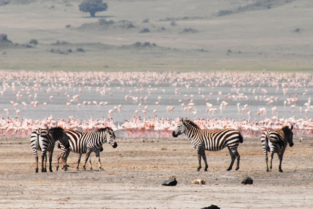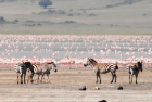 Zebras mit Flamingos, Ngorogoro-Krater, Tansania